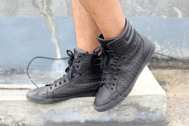 wear something that would still really emphasize my bag and my top. With this, to outstand the color of my top and bag I intended to wear black colors to uplift the extravaganza that I'm wearing. I really embraced the design of my peace sign bag so I accessorize myself with a peace sign necklace. I matched my studded sneaker boots to show you that combining shorts and boots would still look good on guys